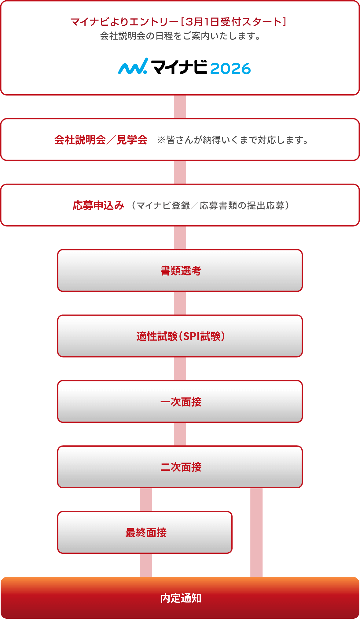 まずはマイナビよりエントリーを行ってください。採用関連情報などを適宜ご案内するとともに、